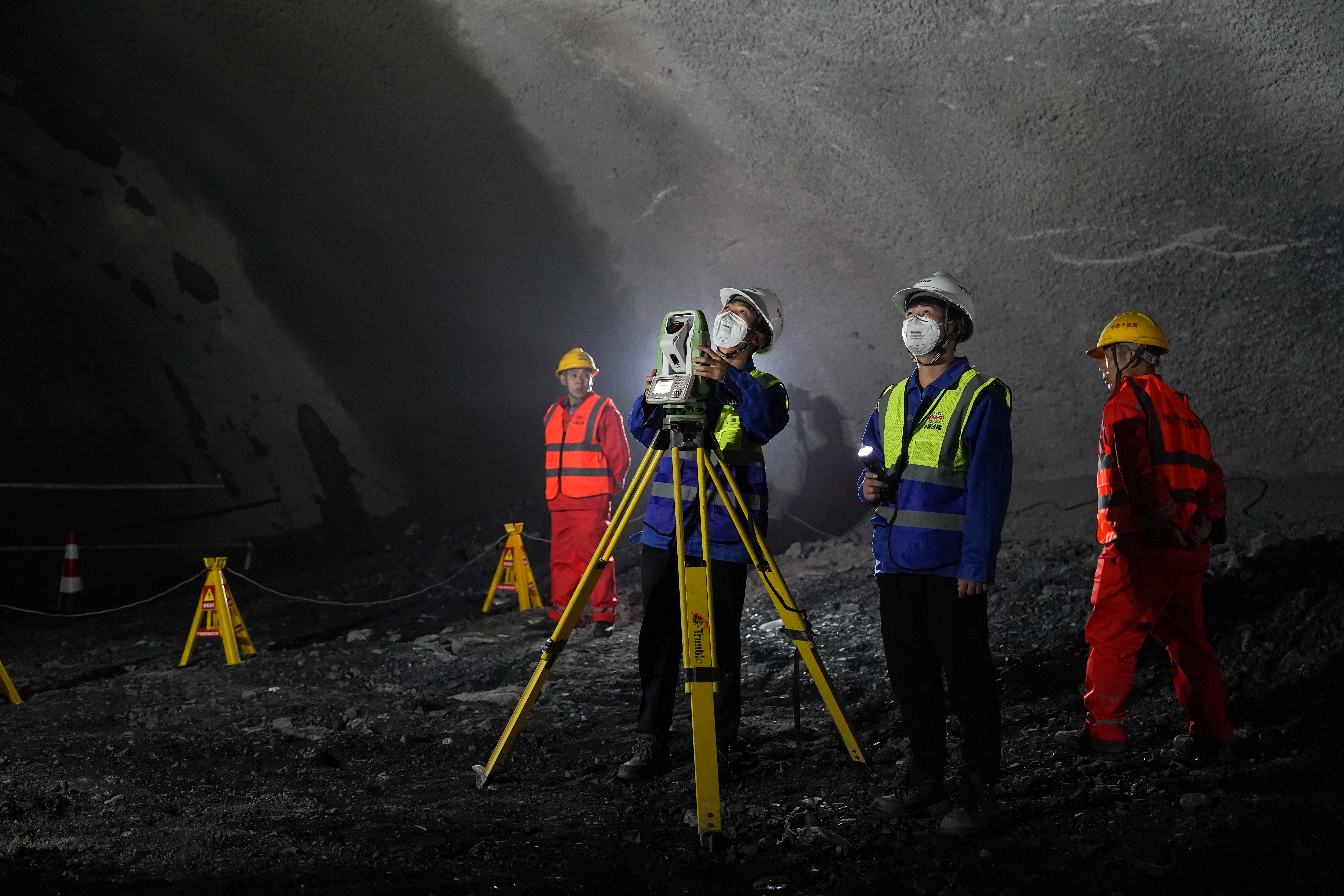 3月29日,工作人员在沪宁合高铁丰山隧道内测量。